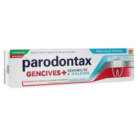 Parodontax Gencives + Sensibilité & Haleine Fraîcheur Intense 75 ml est un dentifrice quotidien au fluor. Il est utilisé pour les problèmes de gencives, la sensibilité dentaire et la mauvaise haleine.